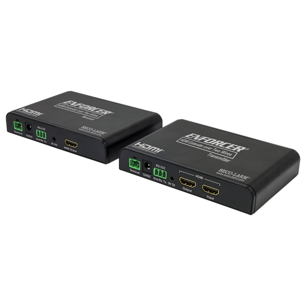 The Enforcer HDMI Extender over Two Wires extends the range of traditional HDMI cabling methods by using an active transmitter and receiver to send video and audio over any two copper wires including Cat5e/6 cables, telephone wires, and coaxial cables. HDMI formats as large as 1080p can be transmitted up to 984ft (300m) between the two units with zero signal loss by using integrated circuits in the receiver and transmitter.