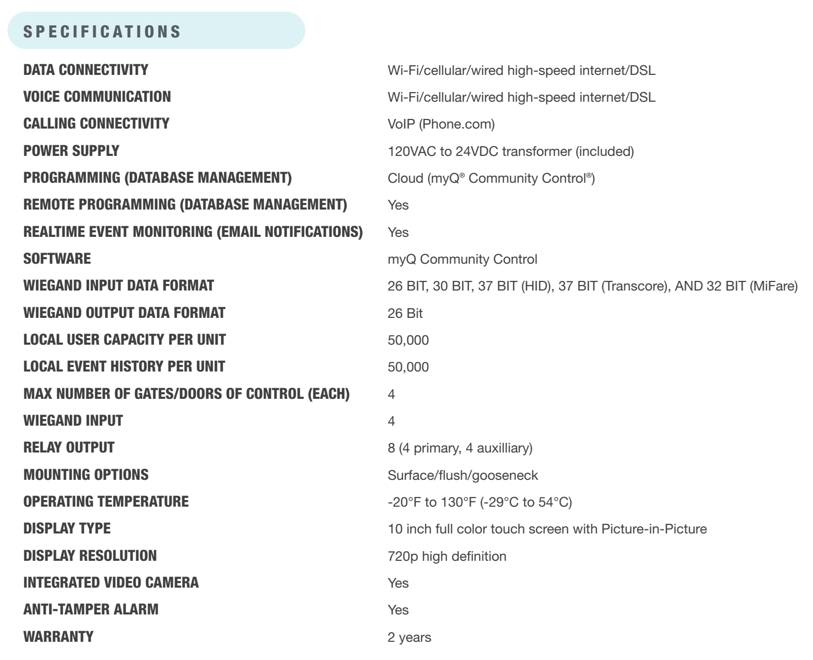 - Data Storage - Video services provide a live stream from an entrance, through myQ Community Control, and capture video clips for every access event; can be stored locally or in the cloud.