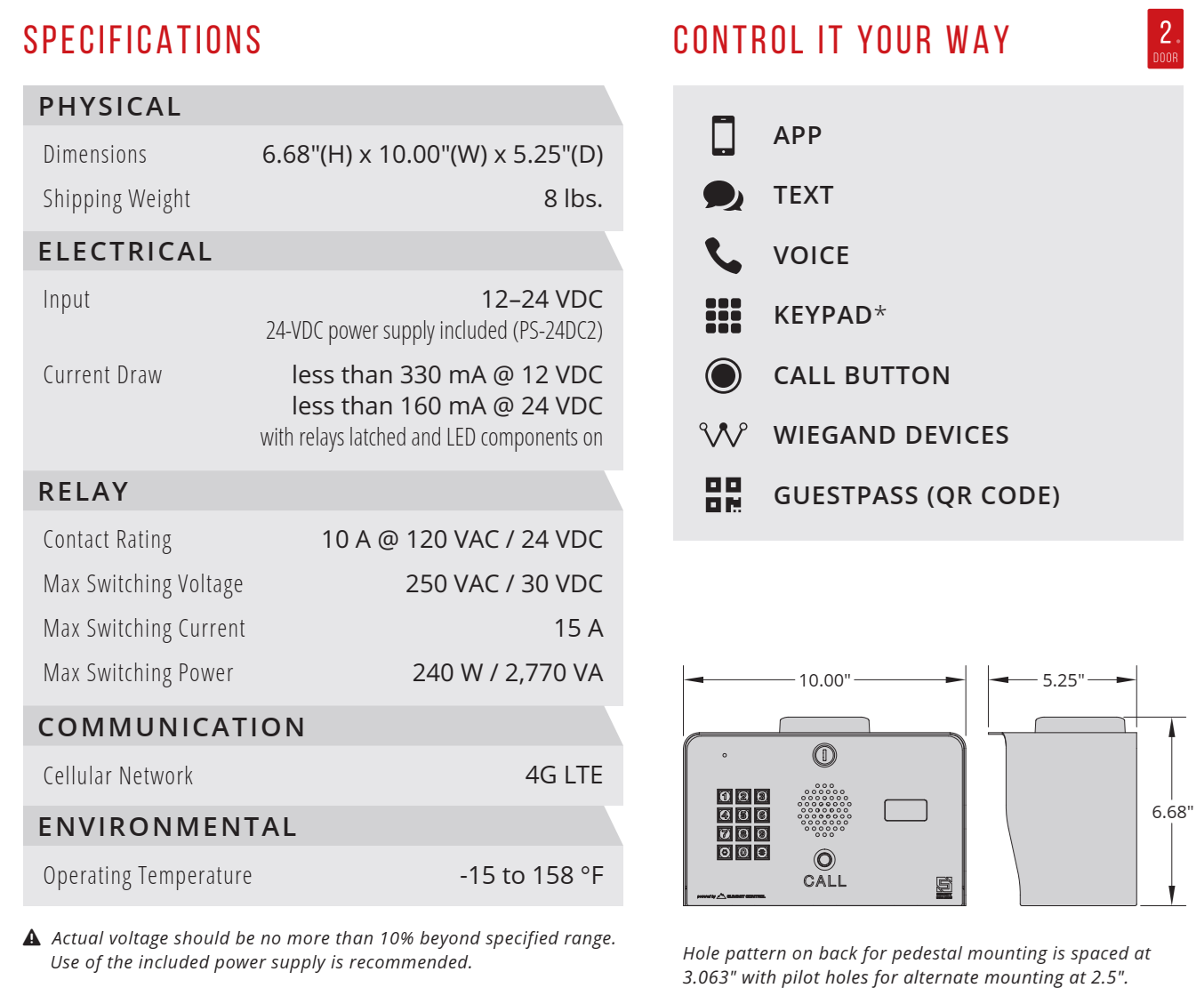 This unit features app, text, and voice control, back-to-back calling of up to 3 phone numbers, simultaneous calling of up to 10 upon call button press, 2 Wiegand inputs, and GuestPass time/use-limited QR code quick access for guests.