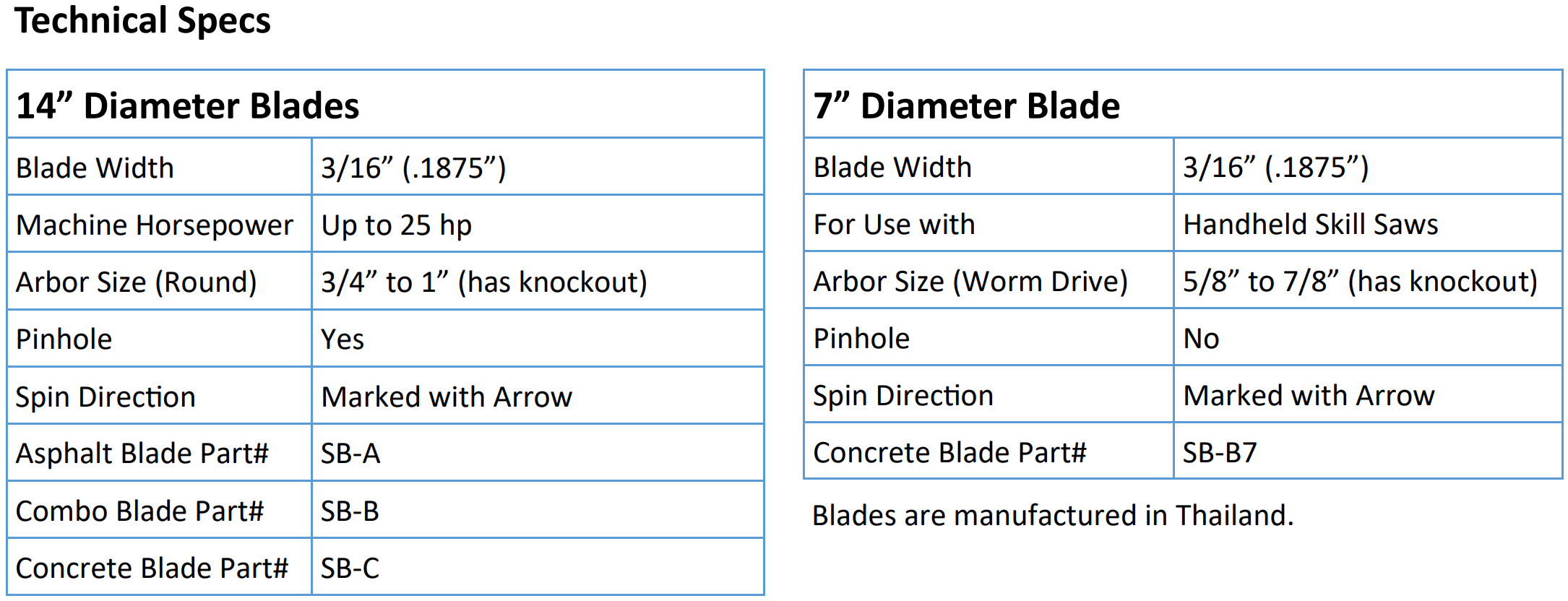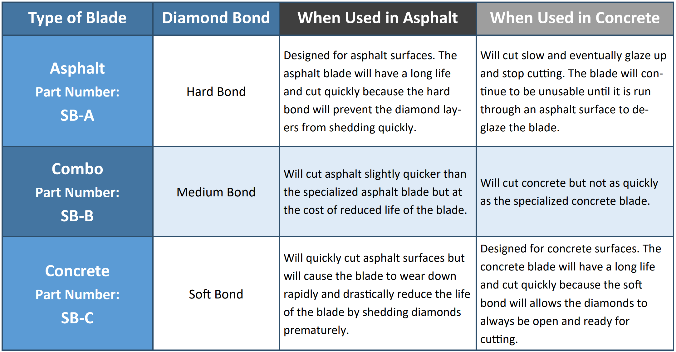 extended blade life. - Diamond bonds and segments formulated to work best with chosen surface type (Concrete, Asphalt, or Combo/Both).