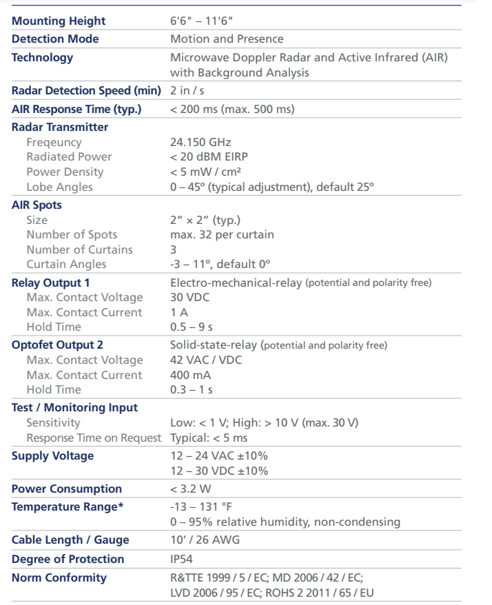 ULTIMO offers advanced presence detection using ULTI-SHIELD technology, which provides uniform sensitivity across the safety curtains. ULTI-SHIELD technology allows for extended or enhanced infrared curtain positioning, ensures no loss of detection and immunities to environmental disturbances.