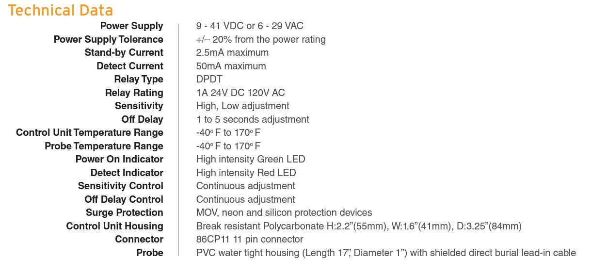 - Probe: PVC watertight housing (Length 17”, Diameter 1”) with shielded direct burial lead-in cable