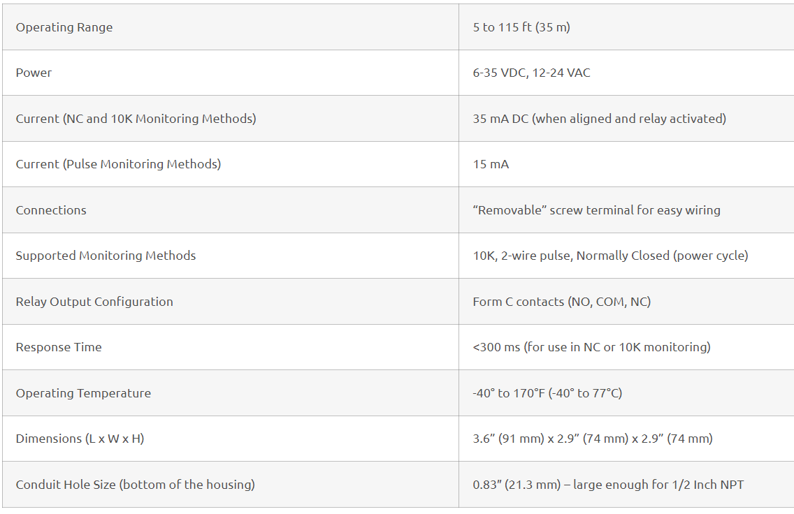 The IRB-MON2 universal UL325 thru beam photoeye has 4 monitoring interfaces: