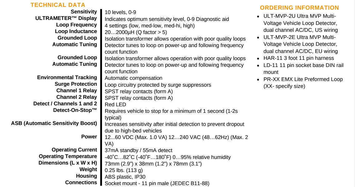 for direction indication. The relay output for each channel may be set for pulse or presence, or the EMX exclusive feature, Detect-on-Stop™ (DOS®). The ULT-MVP-2 features automatic sensitivity boost (ASB) and infinite or normal (5 minute) presence. Four frequency settings provide flexibility in preventing crosstalk in multi-loop applications.