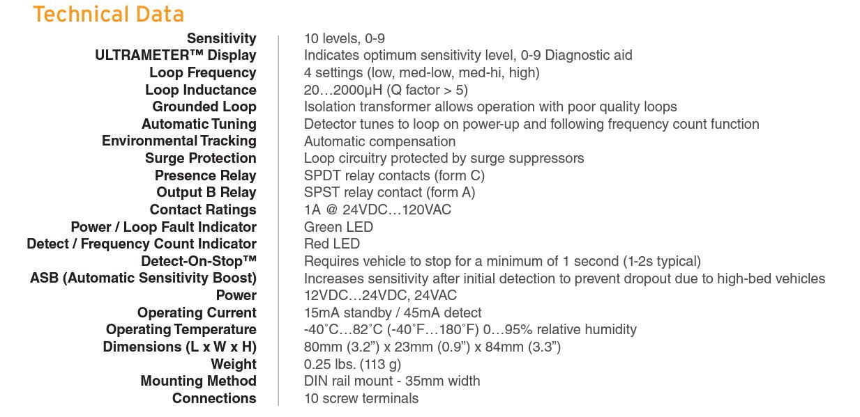 The ULT-DIN vehicle loop detector allows for detection of metallic objects entering the field around an induction loop. This vehicle detector may be used in center, reverse and exit loop positions. The ULTRAMETER™ display feature makes set-up easy by displaying the optimum sensitivity setting required to detect a vehicle positioned near the loop. Ten sensitivity settings allow for fine adjustment of the detection level. The ULT-DIN provides relay contact outputs indicating vehicle presence and a second set of relay contact outputs providing auxiliary functions. The second output can be used for loop fault, pulse on entry/exit, or the EMX exclusive feature Detect-on-Stop™ (DOS®). The ULT-DIN features