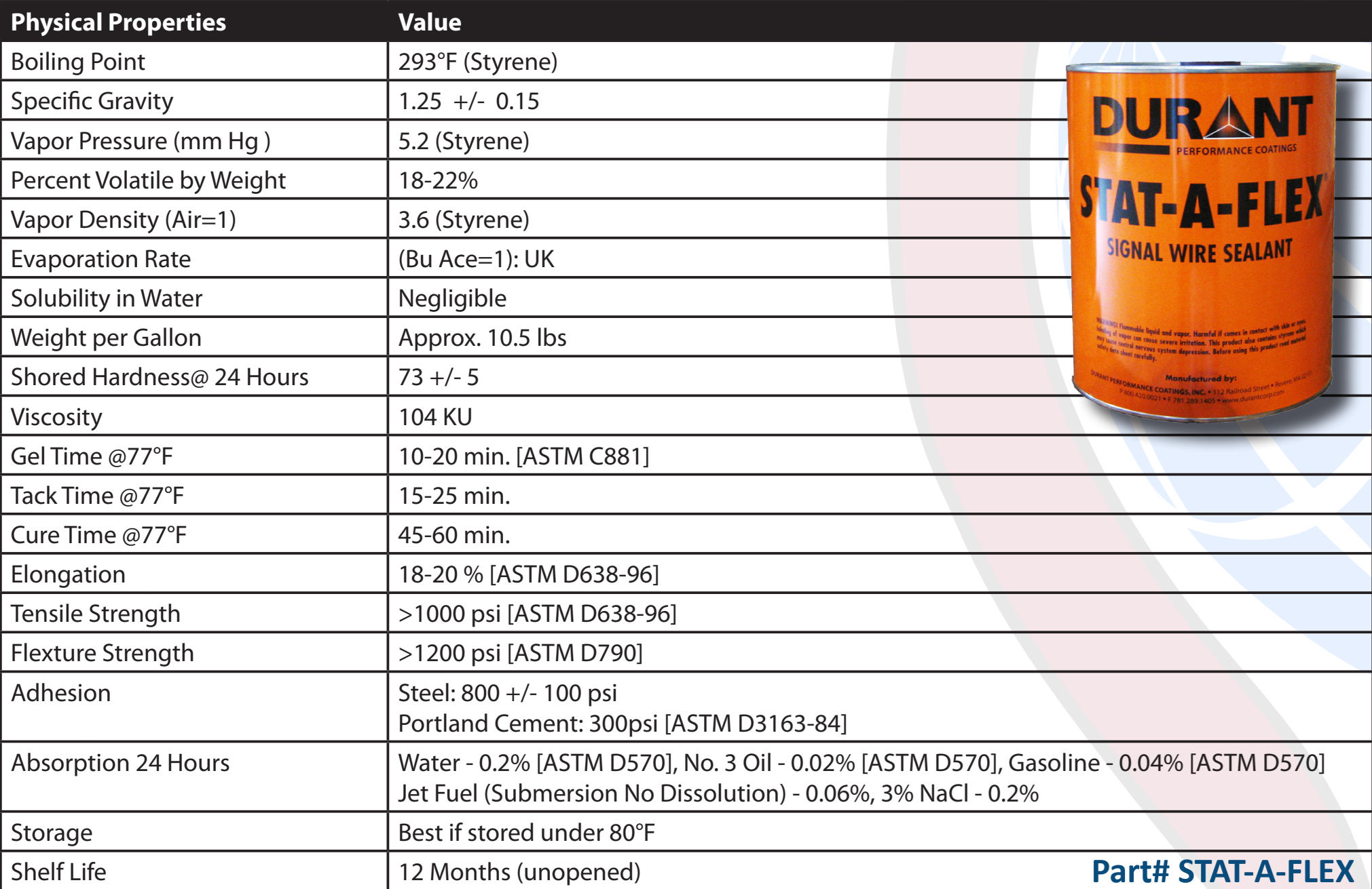 STAT-A-FLEX is a two part polyester resin sealant especially formulated for encapsulating and sealing electrical signal wire in any road surface. STAT A FLEX loop sealant is easily applied, cures quickly and produces a tough weather and chemical resistant seal. STAT-A-FLEX provides maximum protection of all embedded signal wire such as, traffic loop detectors, electrical signal wire and data / communication cable. STAT-A-FLEX is approved for use across the country and in U.S. territories by the Federal DOT and most state DOT™s for public roadway applications.