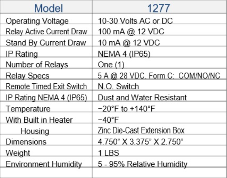 - Built in timer for remote exit door switch or fire access key switch to provide “codeless” entry to authorized personnel