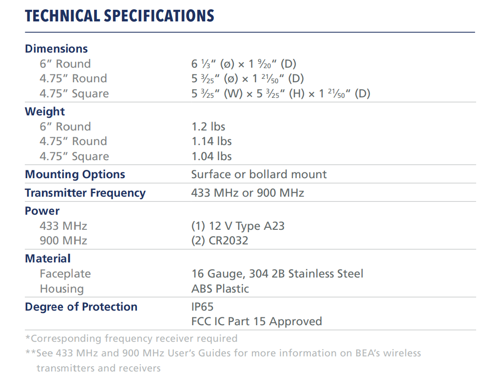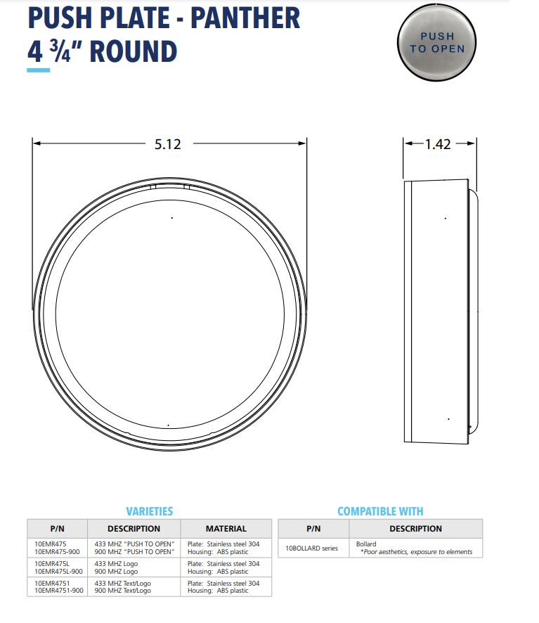 BEA’s PANTHER 10EMR475L consists of 900 MHZ wireless technology integrated into 6 INCH ROUND, 4.75 INCH ROUND and 4.75 INCH SQUARE PUSH PLATES.