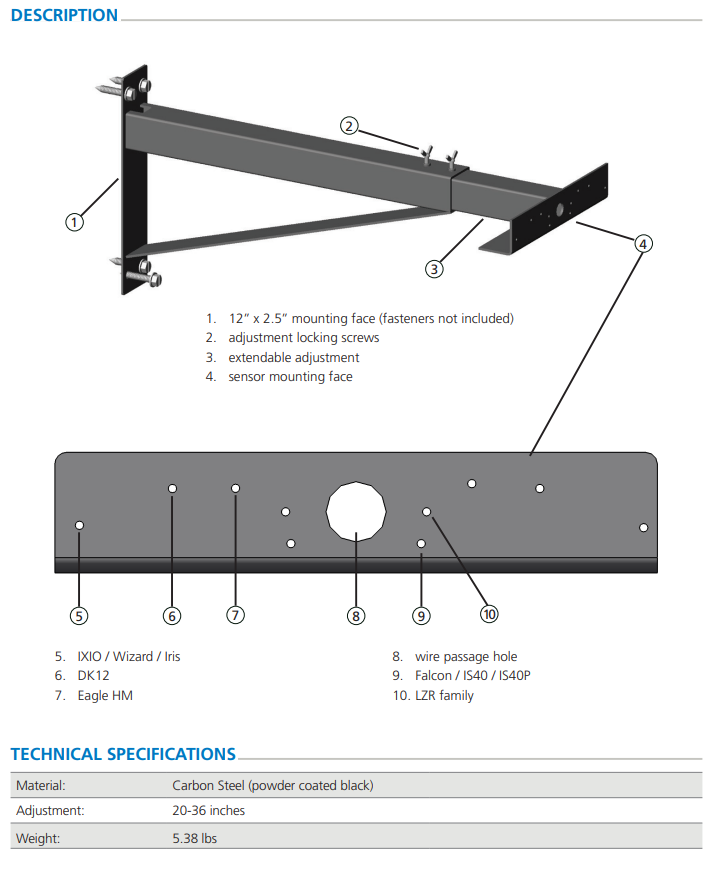 Mounting brackets for industrial applications. The Mini Industrial Bracket offers an extension range of 6 inches to 12 inches.