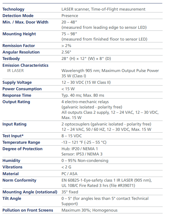 Utilizing Time-of-Flight technology, the LZR-MICROSCAN T eliminates the limitations of infrared-based devices. Its background independence eliminates nuisance detections caused by changing weather and floor conditions, while gyroscopes sense the movement of the door for accurate positioning.