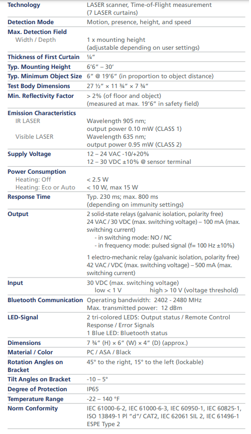 This IP65 rated sensor creates a volumetric detection area by generating seven angled LASER curtains. It has the ability to detect objects based on direction, speed, object size and height. The LZR-WIDESCAN detection field operates independent of ground conditions, allowing for superior functionality in harsh environments.