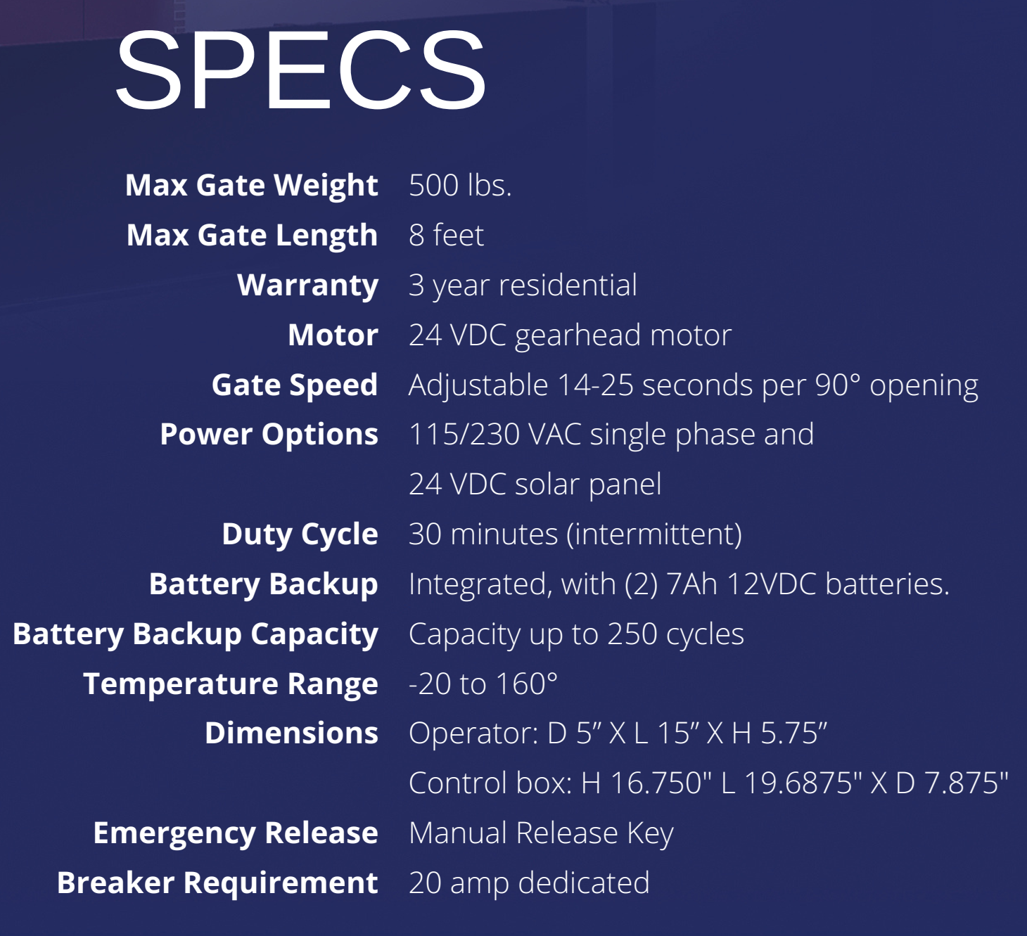 - Gate Speed: Adjustable 14-25 seconds per 90° opening