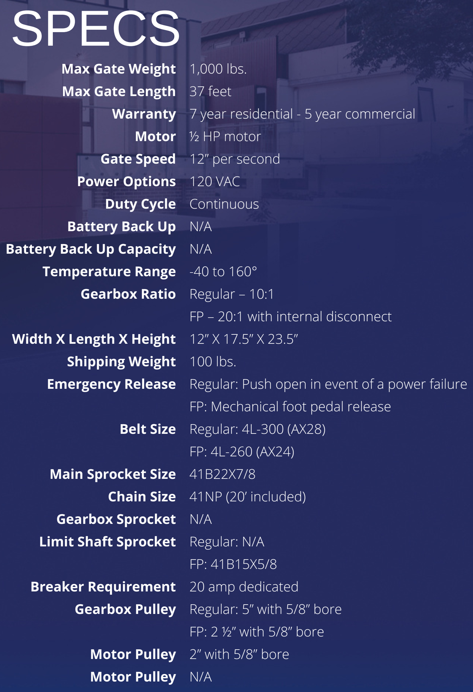 - 1,000 Lbs. – Max Gate Weight