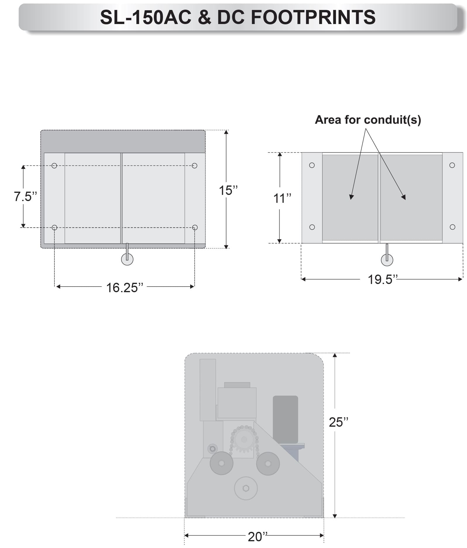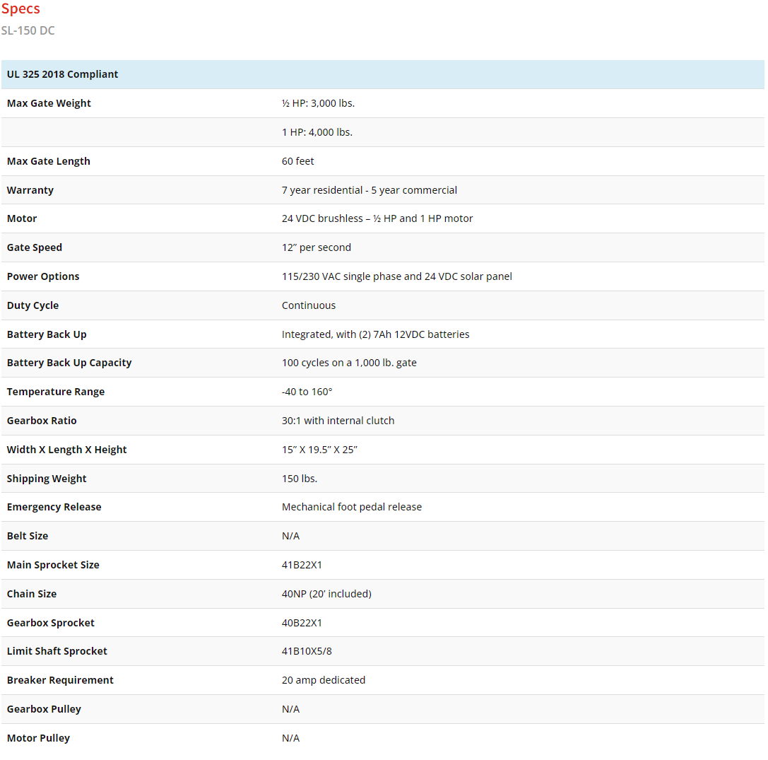 The SL-150DC was designed to meet the demands of gate installers who want a gate operator that can handle heavy traffic, commercial/industrial heavy gates and/or extreme weather conditions. The combination of its heavy duty frame, reliable gearbox and powerful brushless DC motor make even the most challenging installations simple and easy. The SL-150DC has the option of ½ HP and 1HP motors capable of moving up to 3,000 lb. and 4,000 lb. gates, respectively.