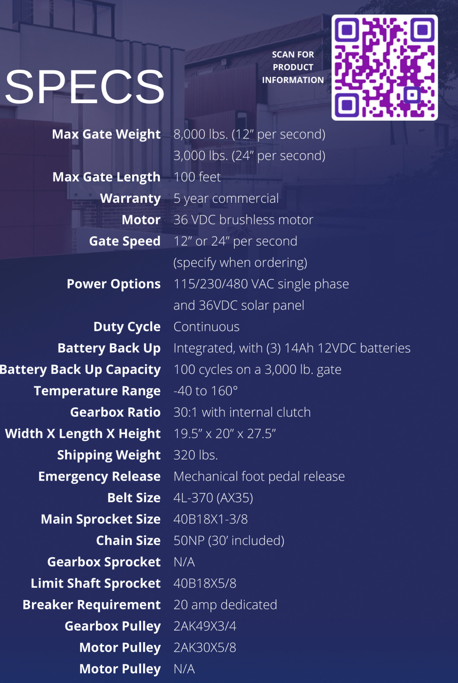The SL-175 DC slide gate operator is equipped with an all new super duty high-strength frame, super duty gearbox, beefed up 36VDC brushless DC motor, optional speed of 12” or 24” per second and a newly in-house design BLDC control board- All combined with the industry leading brushless DC technology (soft start/stop, built in loop rack, integrated battery backup), solar power ready and foot pedal release. The SL-175DC has been tested with gates weighting up to 8,000 lbs. and 75 feet in length.