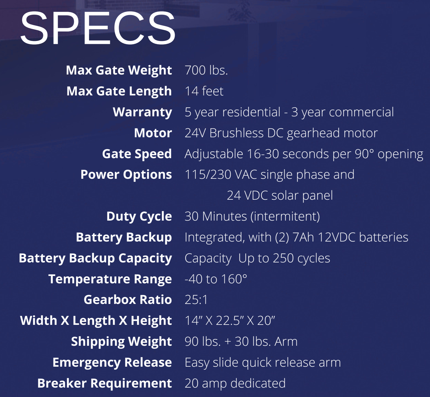 The SW-325DC was designed to both move heavy commercial/industrial gates and to handle the demands of heavy traffic. It’s underarm was designed to have the gate bracket installed at the bottom of the gate in order to preserve a gate’s beautiful design. Also, its easy slide quick release arm was designed to make any installation quick and easy. Mounting options include Pad or Post Mount which must be specified when ordering. The SW-325DC is capable of moving gates up to 2,000Lbs and up to 22 feet.