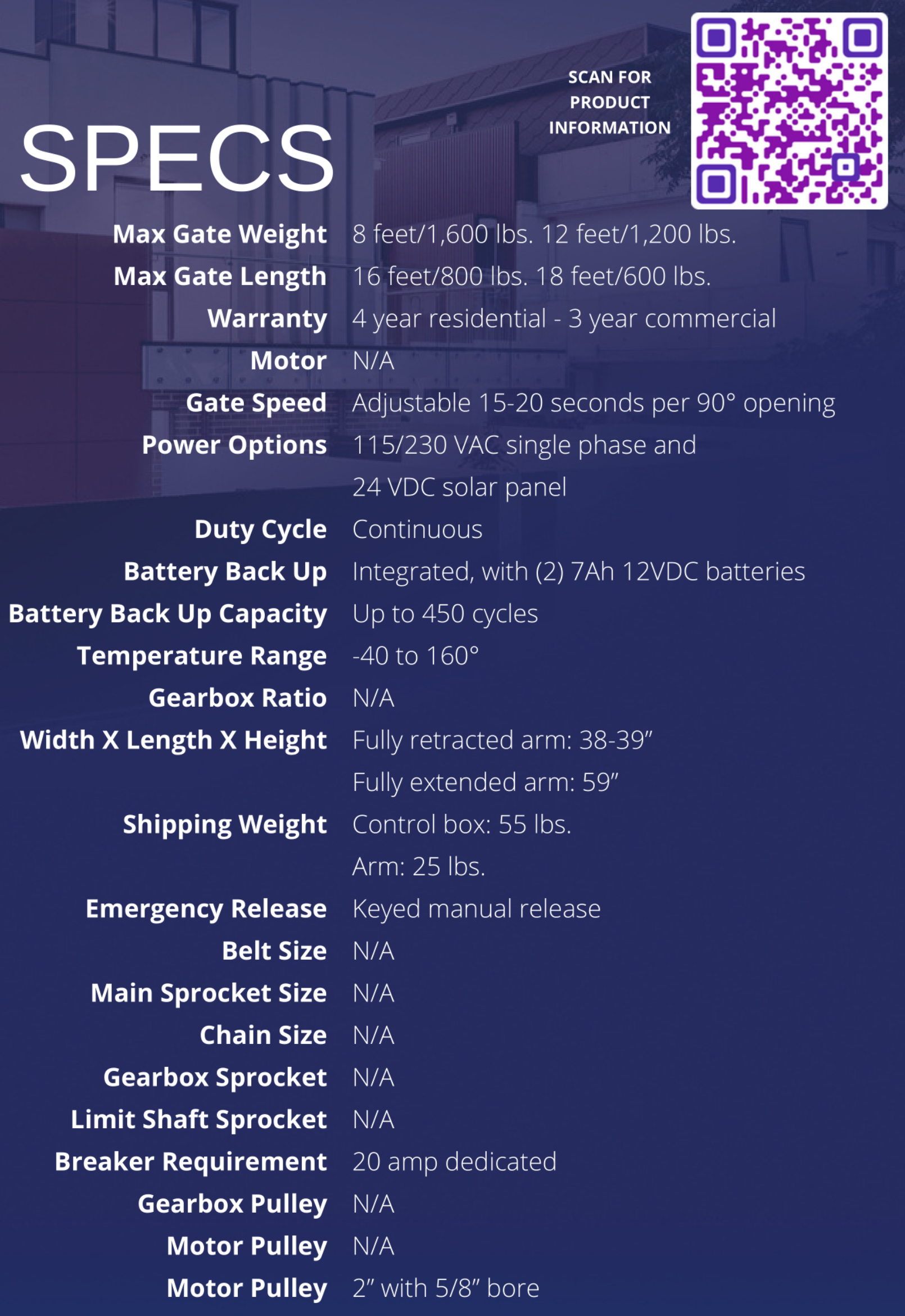 The TORO24 Swing Actuator has a modern & slick design that will complement any gate. It’s easy to install, offers an uninterrupted power supply. Manual keyed release for easy access when necesary. The Control board offers an array of features including programmable logic and an advaced charge controller enhanced for solar applications. It can take 12/24V solar panels up to 80 watts. This will cover most residential and light commercial applications.