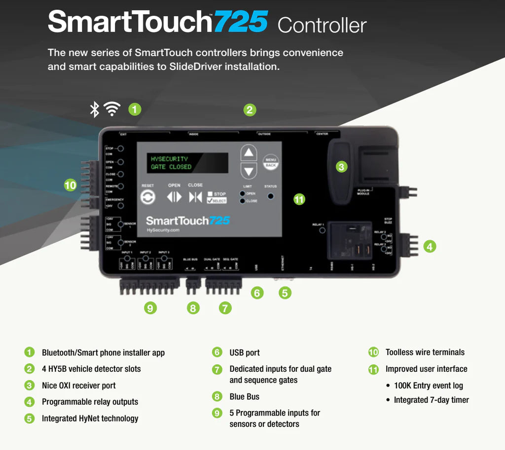 Meet the next generation of SlideDriver™ from HySecurity: SlideDriver II builds upon a legacy of security and reliability with the new SmartTouch 725 control board. The SmartTouch 725 controller adds over 20 features to SlideDriver II and is smarter than ever with use of the HySecurity Installer App.