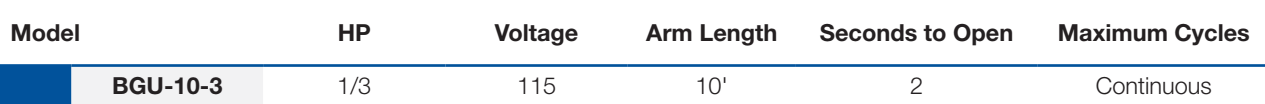 Linear Osco BGU-10-311 1/3HP 115V 1Phase Barrier Gate Operator used for traffic control and parking applications.  Rated for continuous duty with a 10' Wood Arm and an opening speed of 2 seconds.