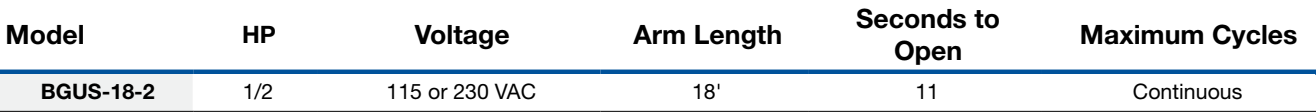 Linear Osco BGUS-18-221 1/2HP 230V 1Phase Barrier Gate Operator used for traffic control and parking applications. Rated for continuous duty at a slower speed with a counter balanced 18' Wood Arm and an opening speed of 11 seconds.