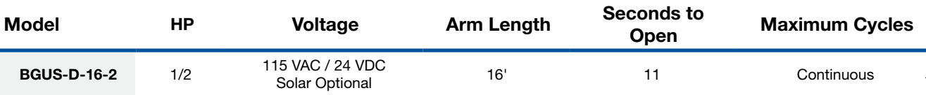 Linear Osco BGUS-16-211 1/2HP 115V 1Phase Barrier Gate Operator with a Full Time DC Battery Backup used for traffic control and parking applications. Rated for continuous duty at a slower speed with a counter balanced 16' Wood Arm and an opening speed of 11 seconds.