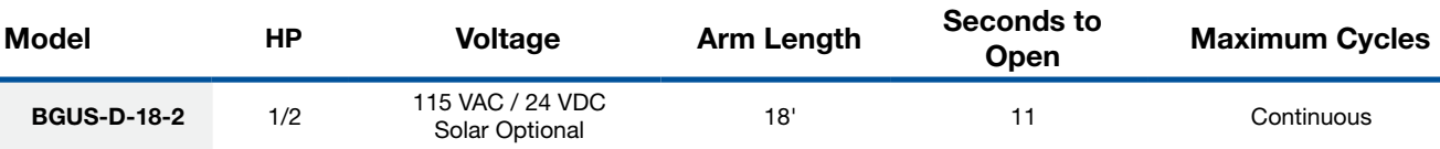 Linear Osco BGUS-18-211 1/2HP 115V 1Phase Barrier Gate Operator with a Full Time DC Battery Backup used for traffic control and parking applications. Rated for continuous duty at a slower speed with a counter balanced 18' Wood Arm and an opening speed of 11 seconds.