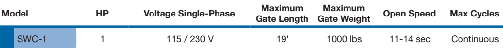 Linear OSCO SWC-111 1HP, 115V, 1Phase Commercial Swing Gate Operator rated for continuous duty with gates up to 19' and 1000lbs and an opening speed of 11-14 seconds.