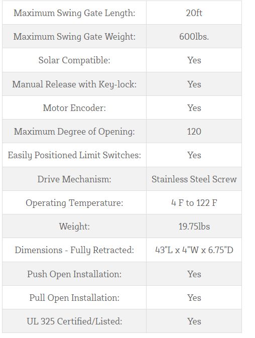 12V actuator for swing gates up to 20 feet long and 600 lbs. Features mechanical release mechanism, nonrotating extension tube and modular design that is easily repaired if necessary.