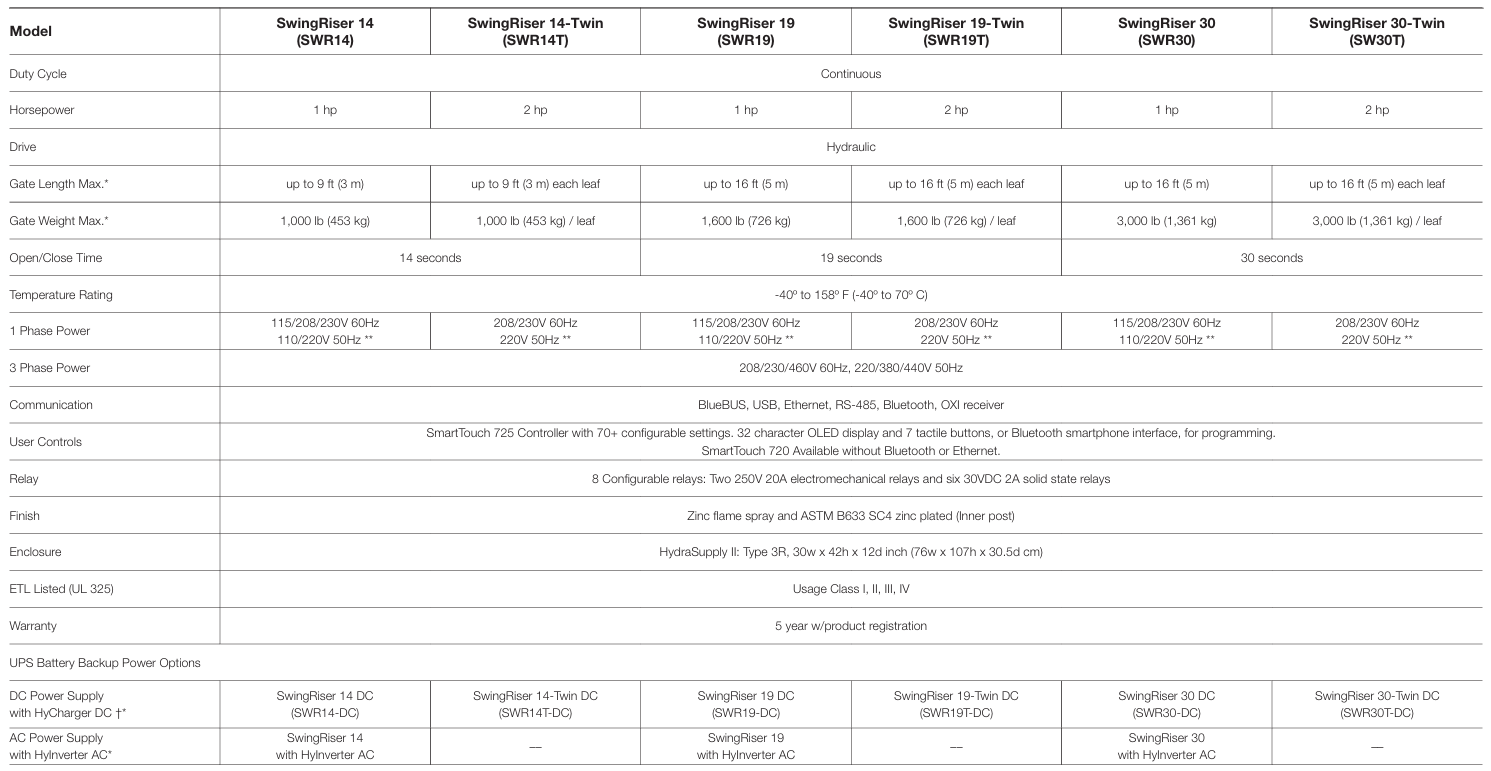 SwingRiser™ models include options for single or dual gates with leaves up to 3,000 lbs. Add an AC Power Supply with HyInverter™ for UPS battery backup. All models use HydraSupply for power and controls, which can be located up to 100 ft. from the gate.