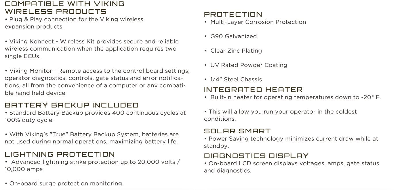 • Viking Monitor- Grants remote access to control board settings, controls, gate status, diagnostics, and error notifications with any compatible computer or hand-held device