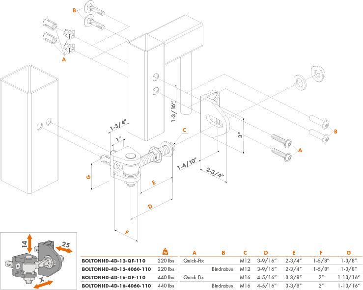 Locinox BOLTONHD-4D-QF-M16-110-02-9005 - 180° Bolt-on 4D adjustable hinge - Black