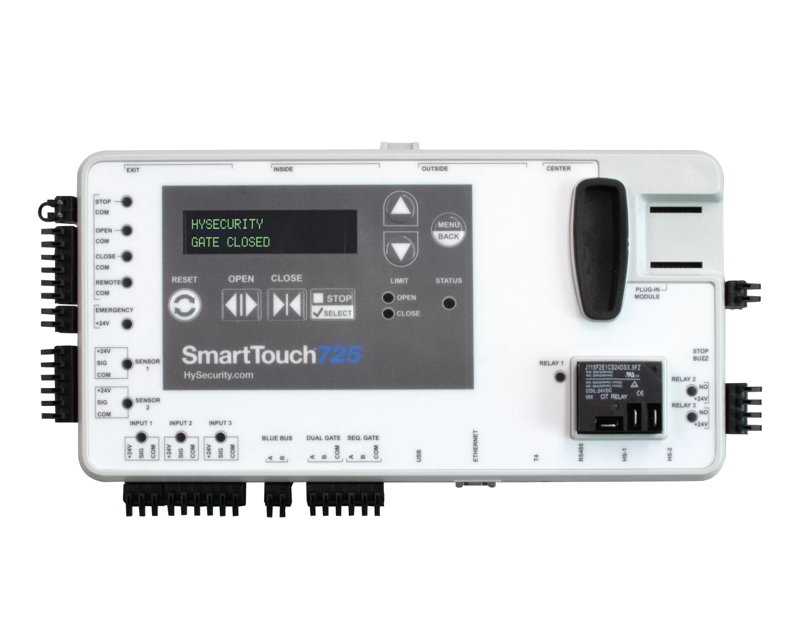 - Integrated SmartTouch725 Controller - The integrated HySecurity SmartTouch 725 features a high temperature resistant plastic enclosure, improved immunity to damage from lightning, improved circuitry on control inputs, improved Hy5B detector ports, and a low power design to optimize solar performance.