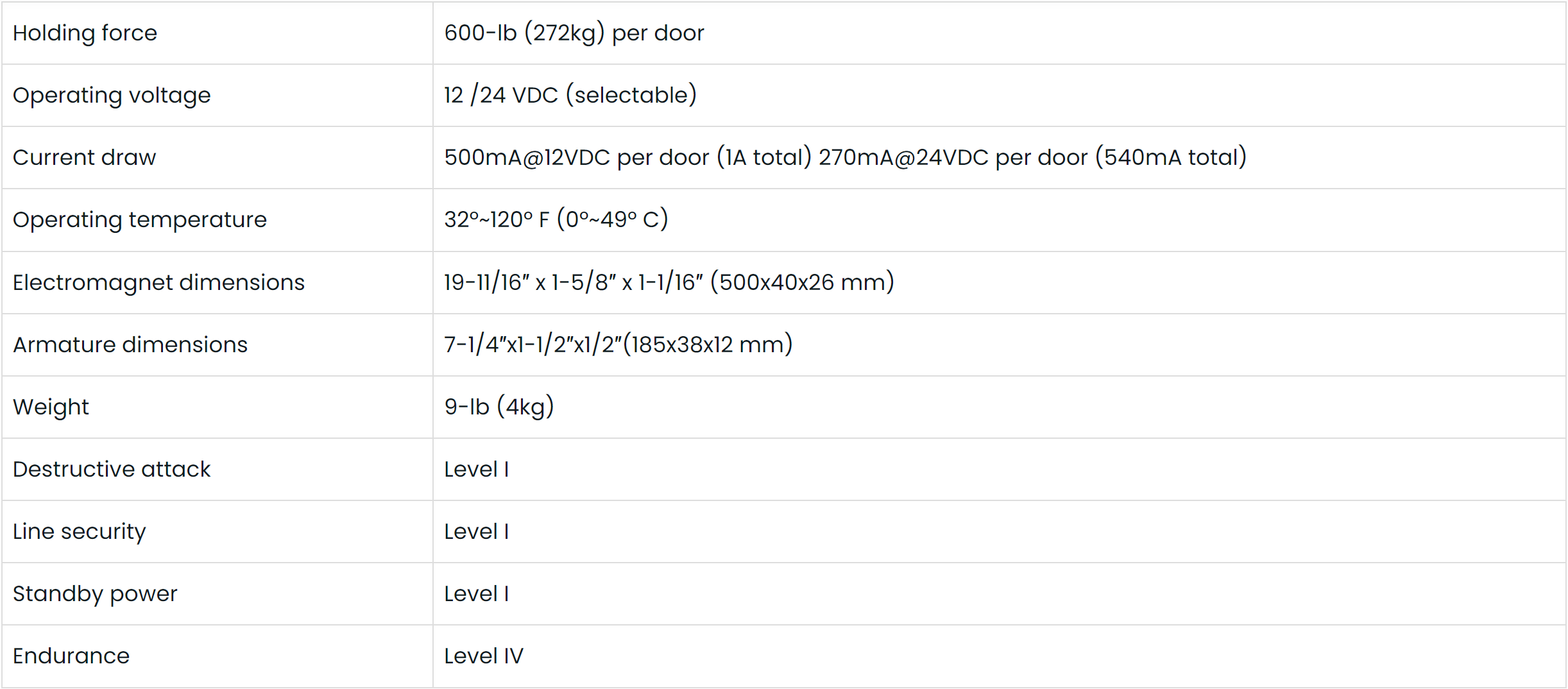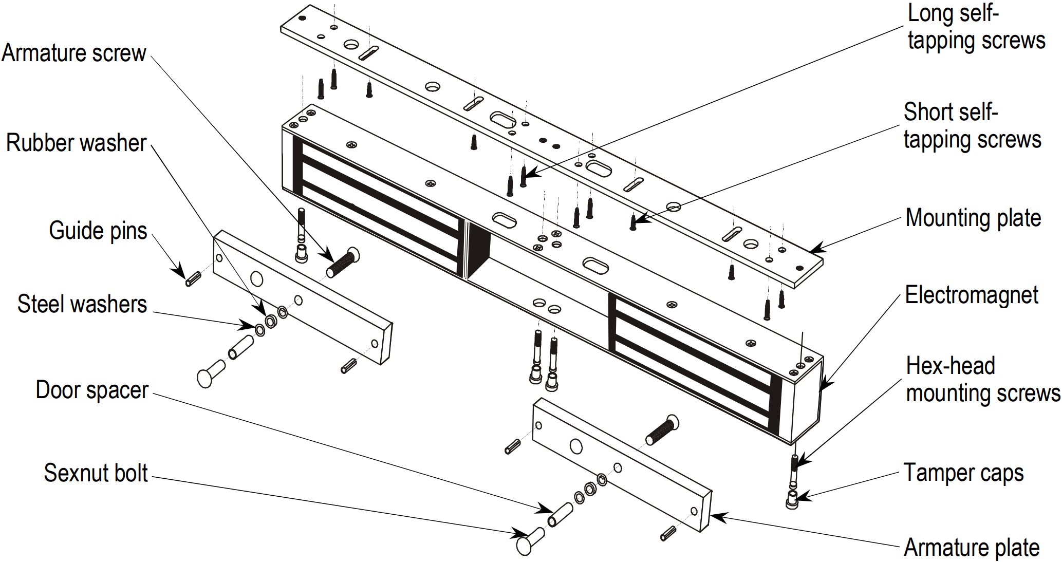 The E-941Dx series of electromagnetic locks is the ideal way to secure a door against unauthorized entry. When power is applied to the electromagnetic lock, it creates an extremely strong magnetic field. The electromagnet is strongly attracted to the steel armature plate which is mounted on the secured door. Once the electromagnet is deactivated, the secured door will function normally without any residual magnetism.