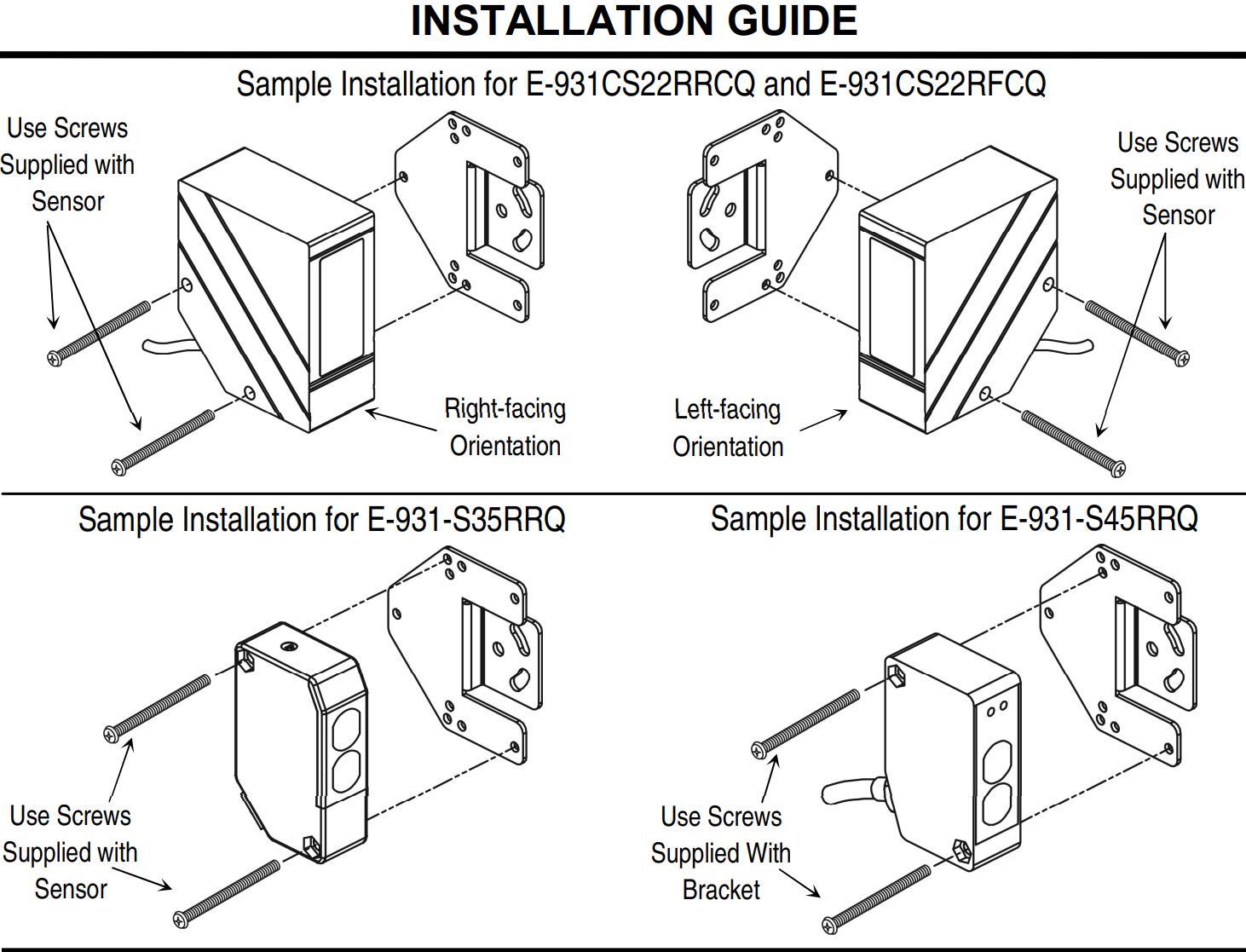 - Note that this bracket can be rotated 180 degrees for either left- or right-facing orientation as shown in the illustrations for E-931CS22RRCQ and E-931CS22RFCQ above. Please note that each sensor model uses different mounting holes