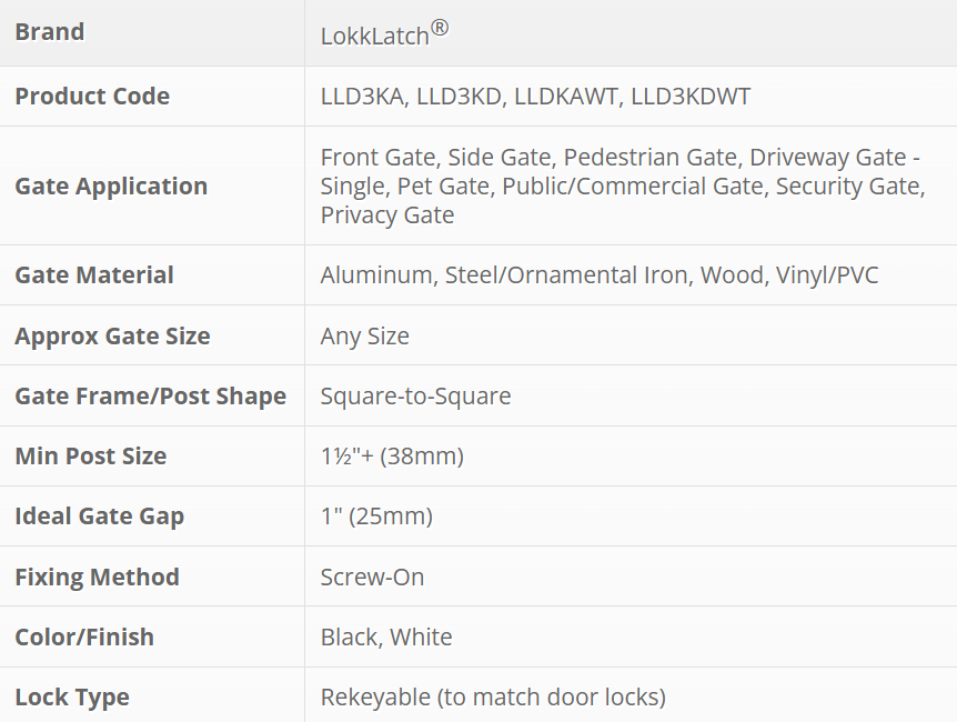 NEW LokkLatch® DELUXE Series 3 model is even better, stronger and faster to install. It is the ultimate privacy and security gate latch for homes and industrial areas. It operates and locks from both sides of the gate, and so eliminates the need for padlocks, chains or handle-holes in gates. The LokkLatch DELUXE S3 is made of super-strong, rust-free polymers and stainless steel components, so it’s tough and durable. Side-fixing legs provide easy fitting alignment and extra fixing strength. The two-part design provides an 'External Access Button' that allows street-side entry. Conveniently, the two security lock cylinders can be rekeyed to match other household doors and accesses. (See your locksmith prior to latch installation.) The LokkLatch® DELUXE S3 also offers vertical and horizontal adjustment to ensure proper fit and reliable operation. It can be fitted to all square-posted gates up to 6" (150mm deep) and can be adapted to left- or right-swinging gates.