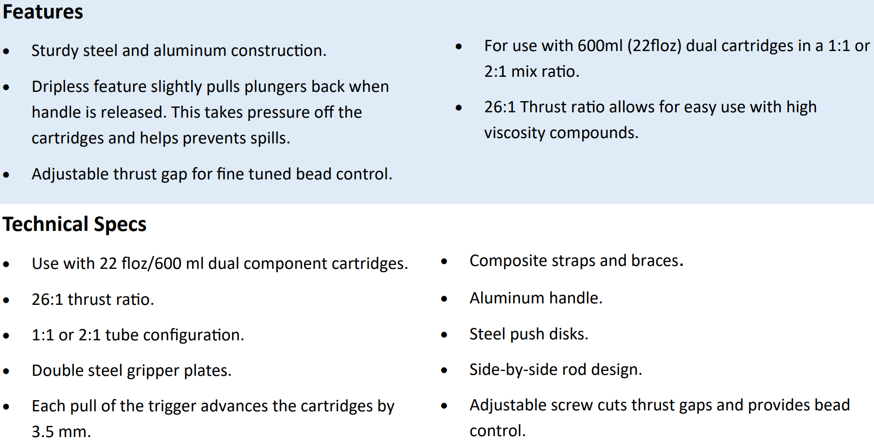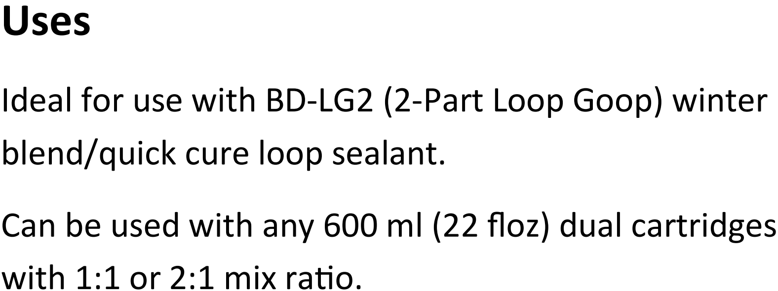 - For use with 600ml (22floz) dual cartridges in a 1:1 or 2:1 mix ratio.