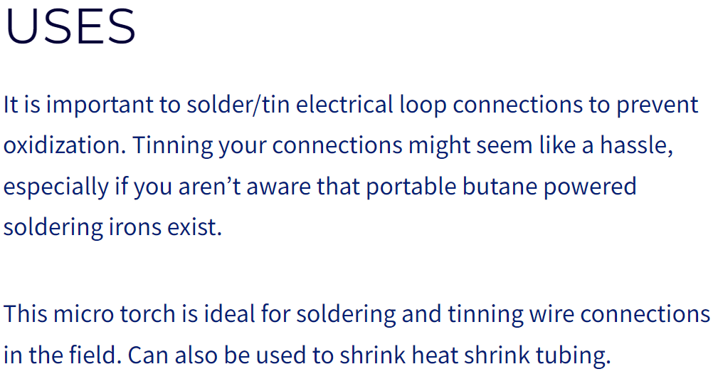 It is important to solder/tin electrical loop connections to prevent oxidization. Tinning your connections might seem like a hassle, especially if you aren’t aware that portable butane powered soldering irons exist.
