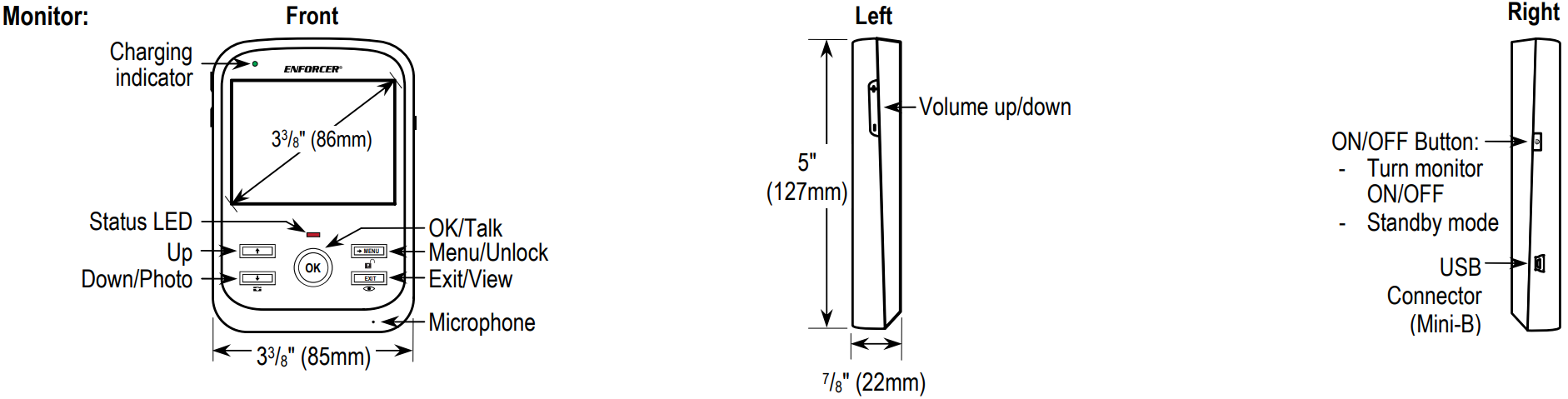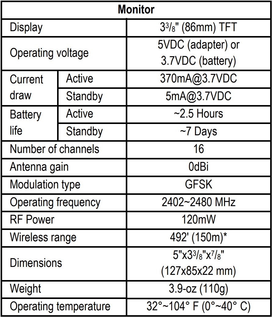 • Monitor Operating Voltage: 5VDC (Adapter) or 3.7 VDC (Battery)