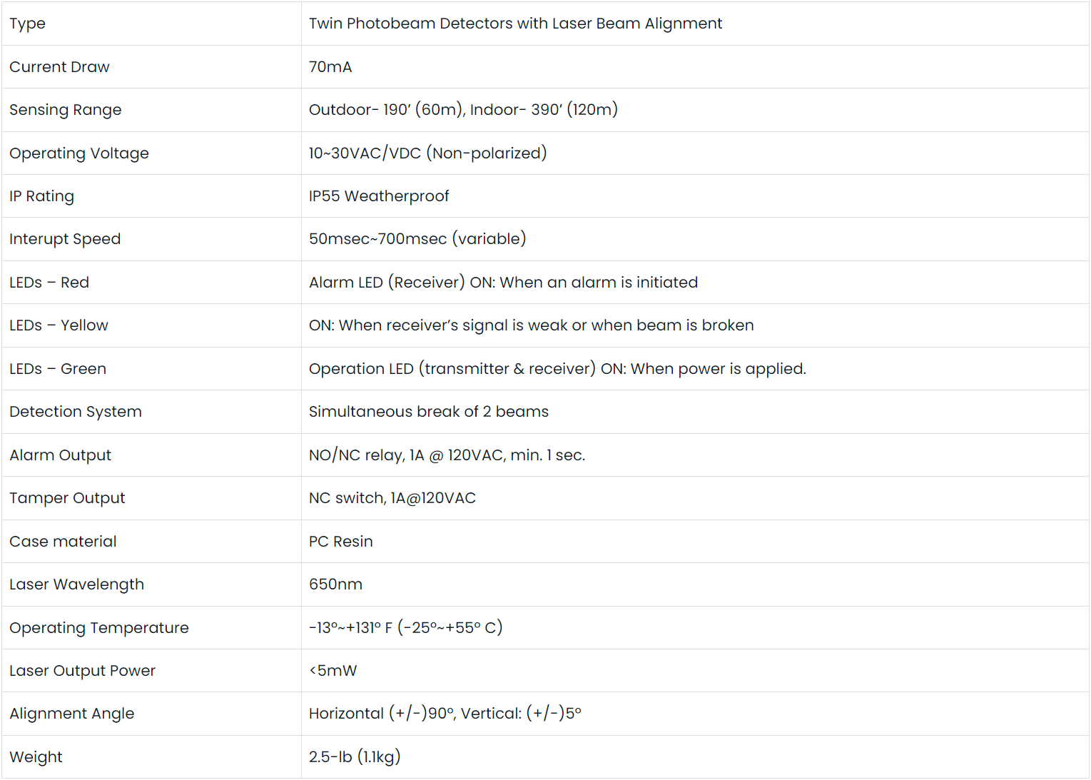 Enforcer E-960-D190Q Long Range Photobeam Detectors are easy-to-install with laser beam alignment and provide extended range. Designed to provide reliable perimeter security both indoors and outdoors.