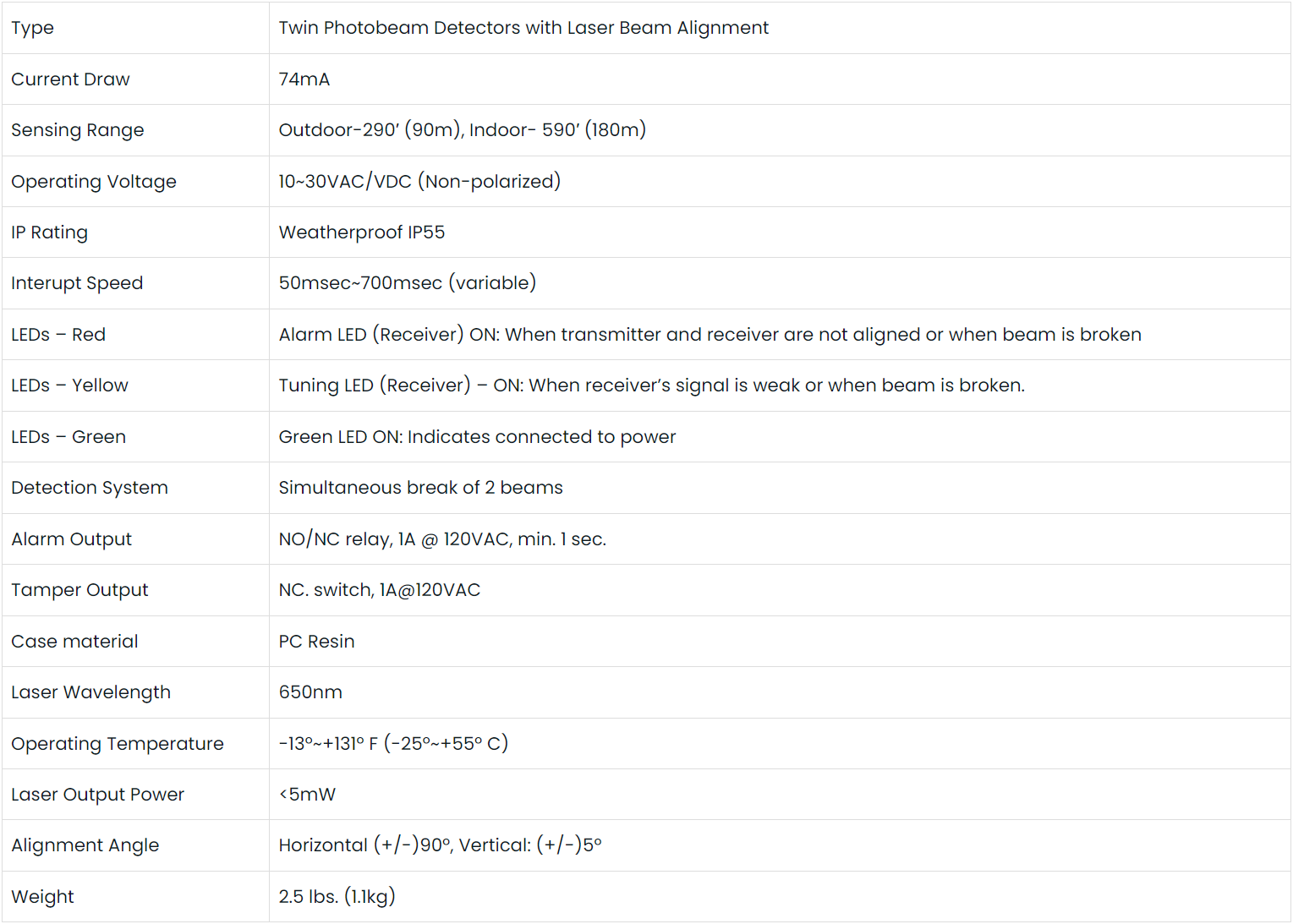 - Twin infrared beams provide reliable perimeter security, minimizing false alarms from falling leaves, birds, etc.