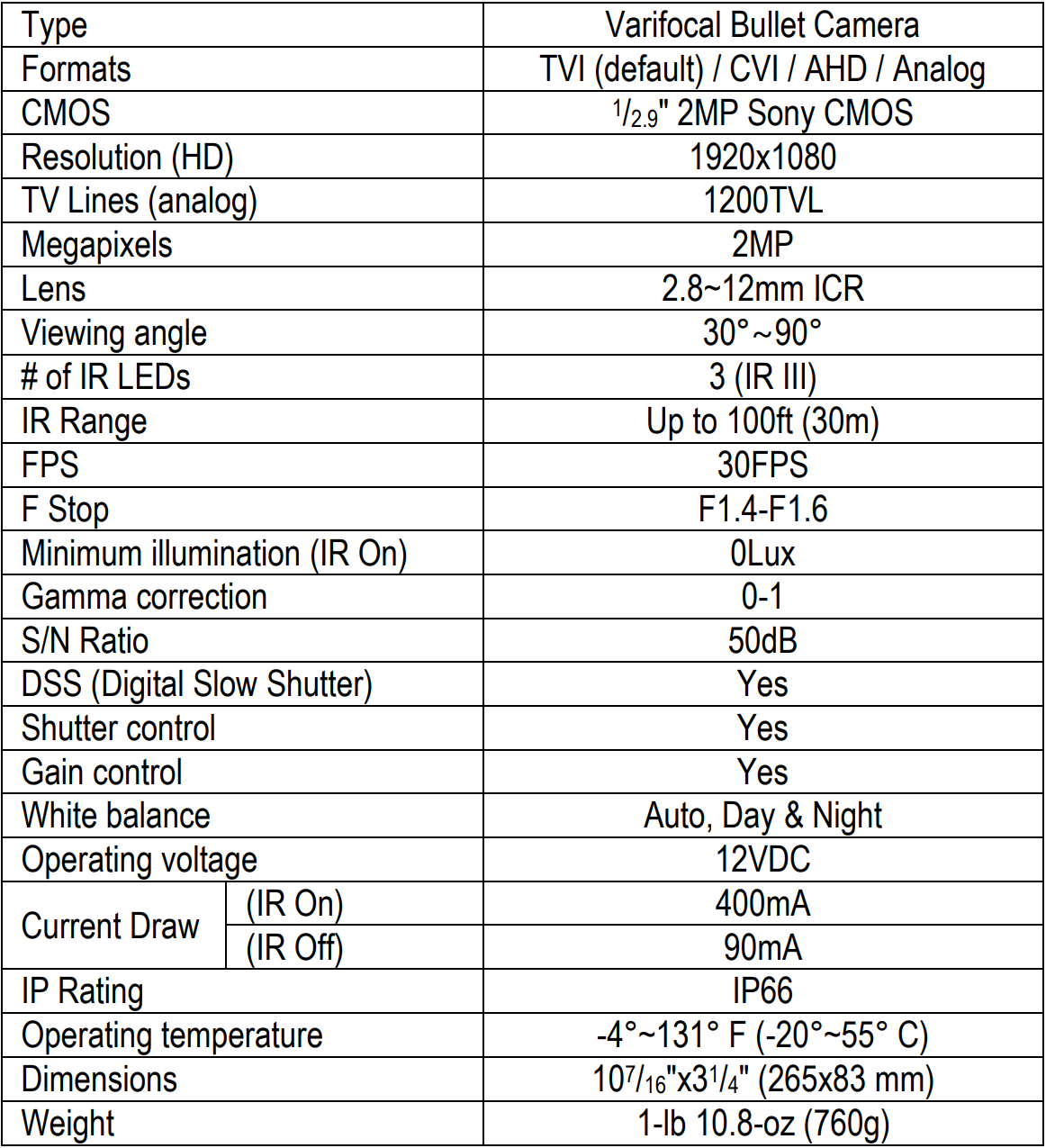 With the Seco-Larm EV-Y1201-AMWQ Varifocal Bullet Camera you are able to select between multiple formats: TVI, CVI, AHD, and Analog with 1080p resolution throughout all formats. The camera is able to be controlled with an OSD Joystick. It is comes with a Rugged and  weatherproof (IP66) construction because the cables are concealed in the bracket, this also helps to prevent tampering.