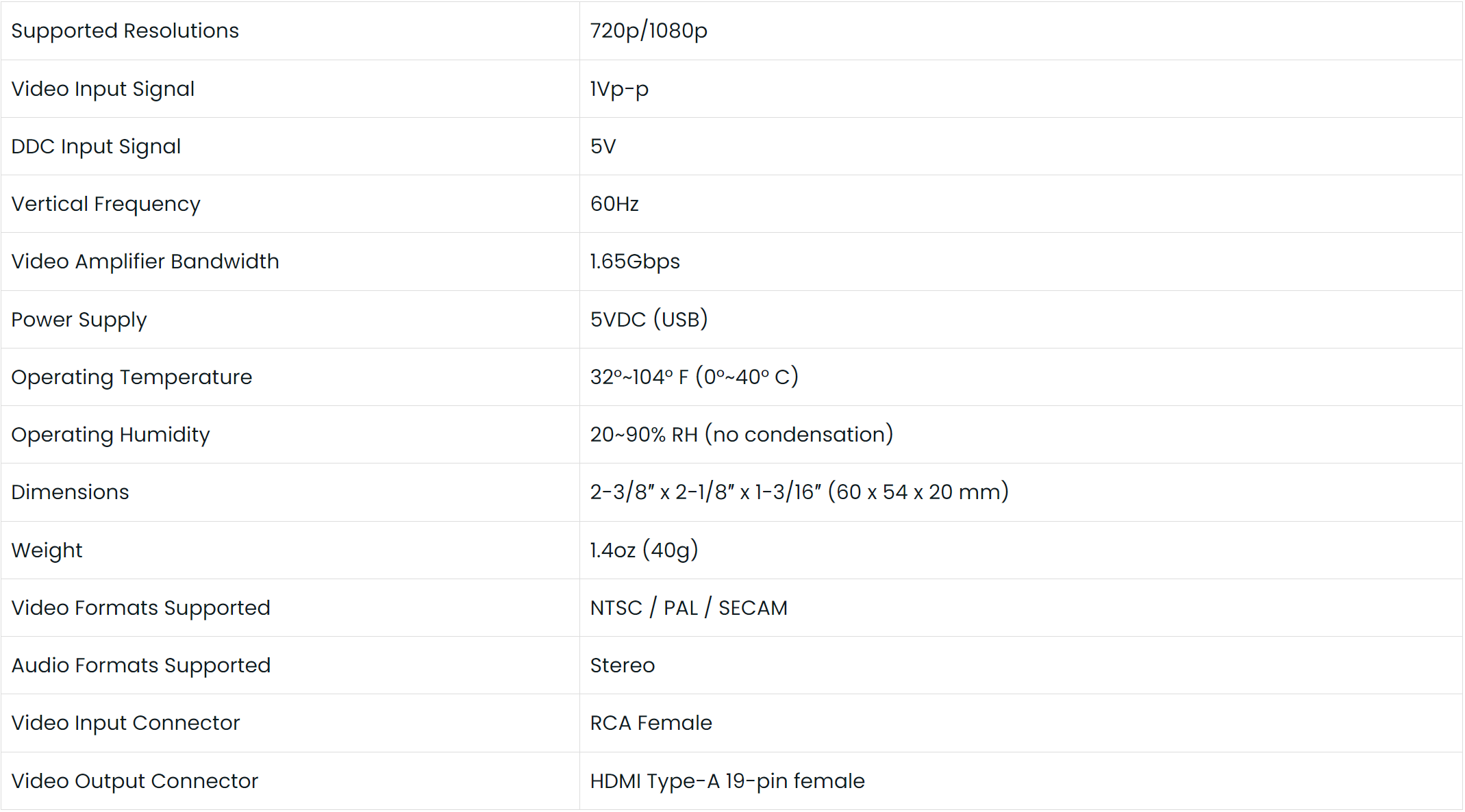 - Converts composite video and stereo audio to 720p or 1080p HDMI.