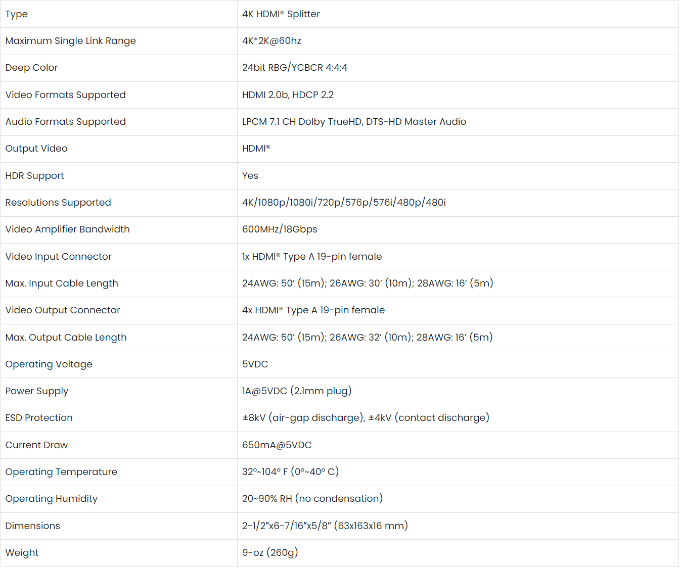 The ENFORCER 4K HDMI Splitters allow for one HDMI source to simultaneously transmit to up to four different monitors. The splitters work with most HDMI devices, delivering the very best in digital audio and video signals with HD resolutions of up to 4K@60Hz. An LED indicator clearly displays power status as well as which outputs are active. The 4K HDMI Splitters can be daisy chained up to four levels for even more outputs.