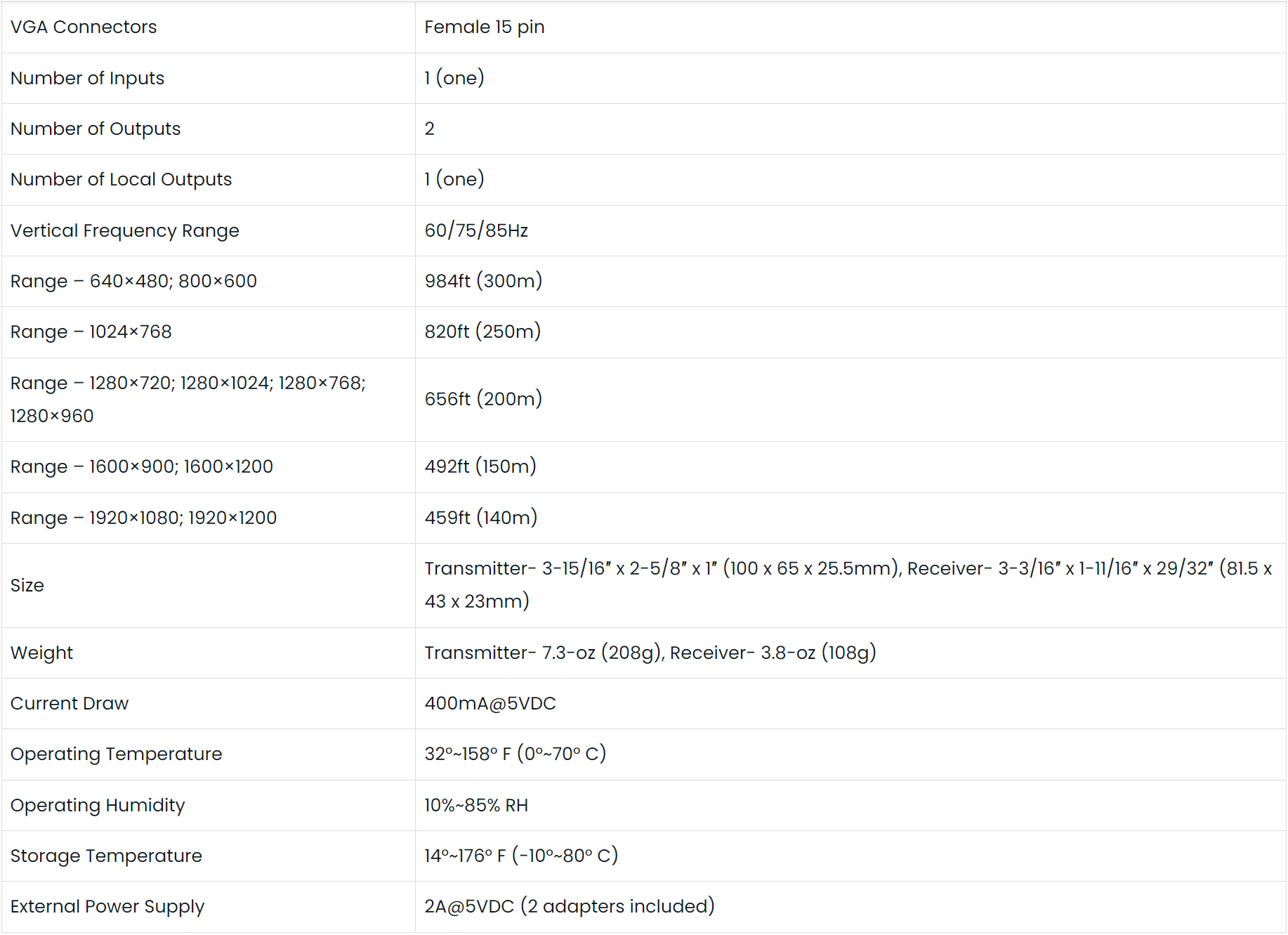 - Transmits VGA signals from personal computers, DVRs, video splitters, to CRT or LCD monitors or VGA projectors