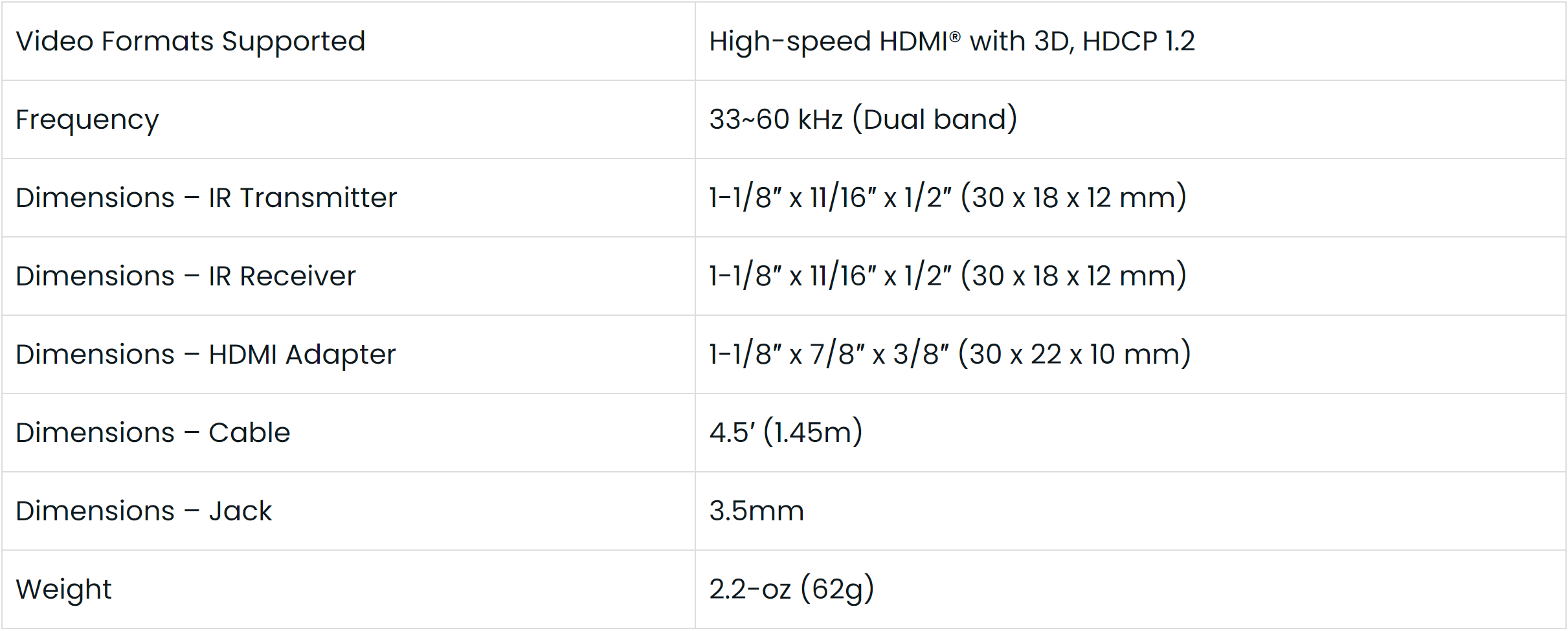 - Includes 2 HDMI® adapters, 1 IR transmitter, and 1 IR receiver