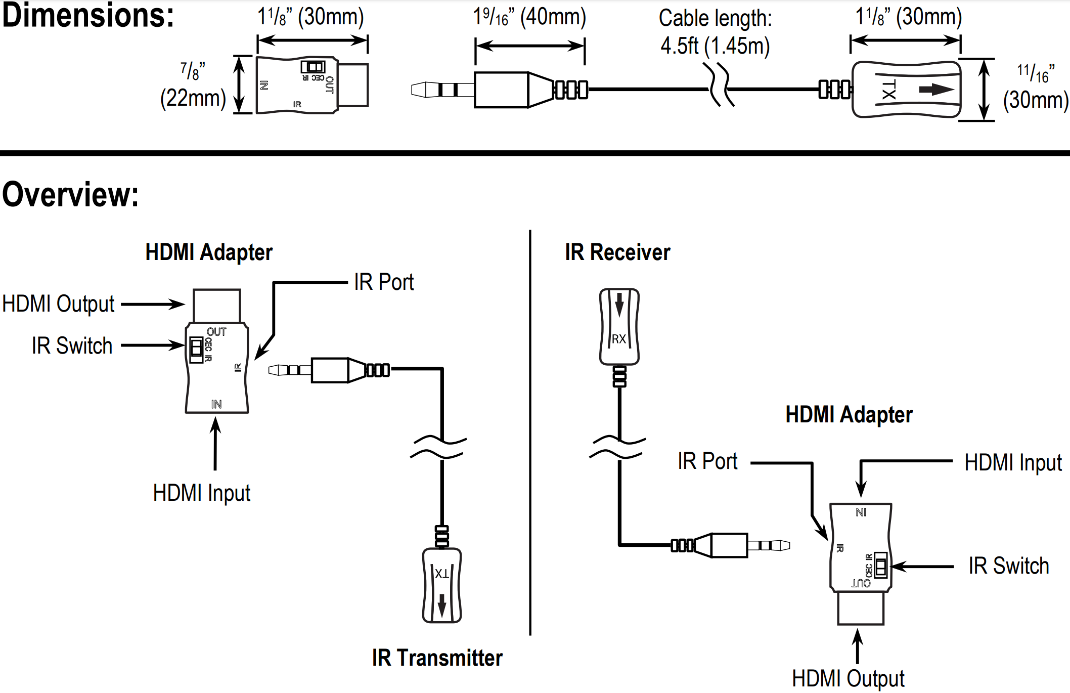 The Enforcer IR over HDMI Kit is the ideal solution for installations where a DVR, Blu-Ray player, or other HDMI source is in a different room or location than the HDMI display. The adapter’s discreet and convenient design installs between the device and the HDMI cable. The IR transmitter and receiver are each built with a 4.5ft (1.45m) cable for an easy and clean installation.
