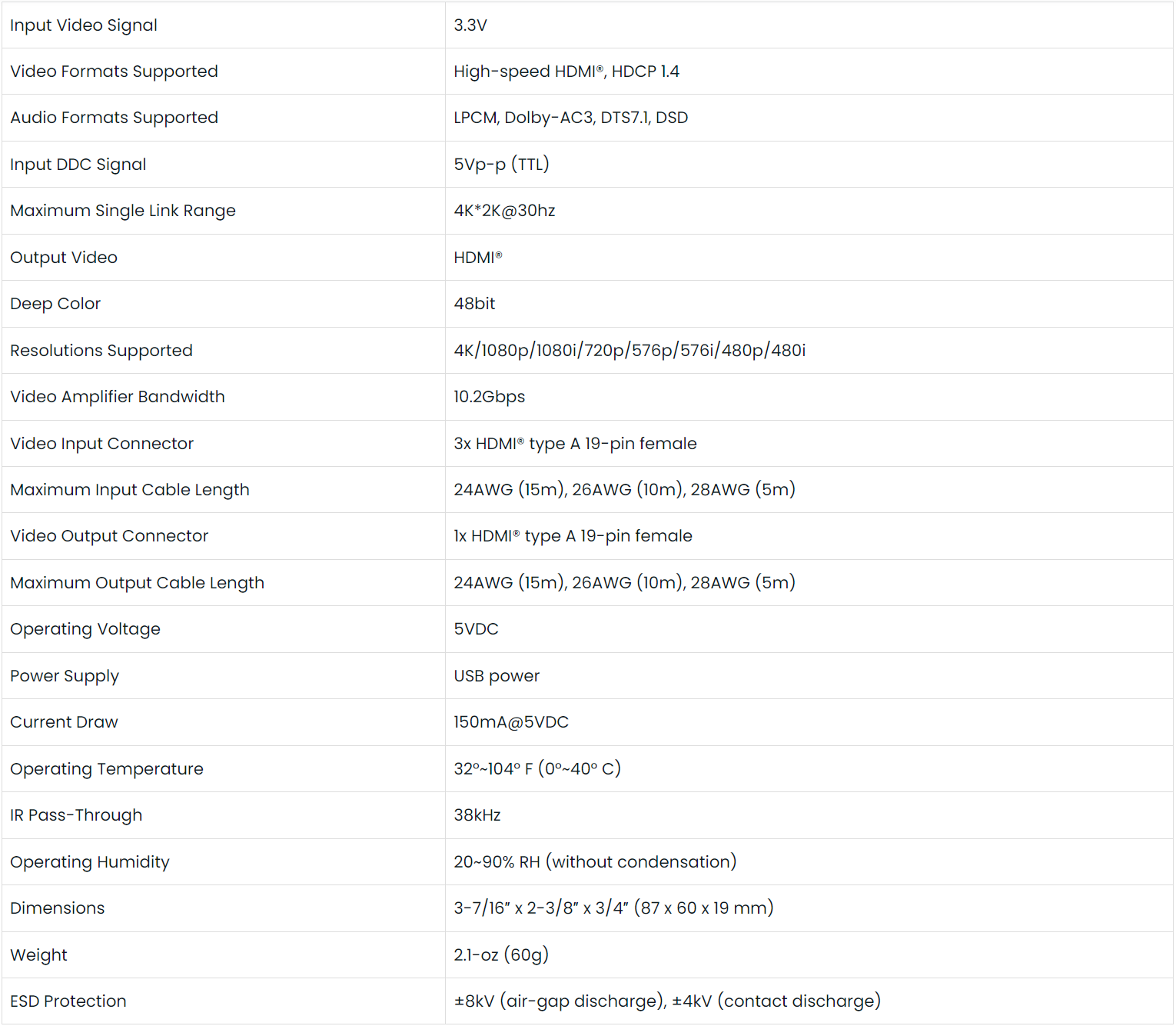 The ENFORCER 4K HDMI Switchers allow easy switching between multiple HDMI sources. The switchers work with most HDMI devices, delivering the very best in digital audio and video signals with HD resolutions of up to 4K/2K. An included remote control easily switches between HDMI sources. LED Indicators clearly display the HDMI source being used. The switcher will automatically select the active input for added convenience. The 4K HDMI Switchers can be daisy chained up to four levels for even more inputs.