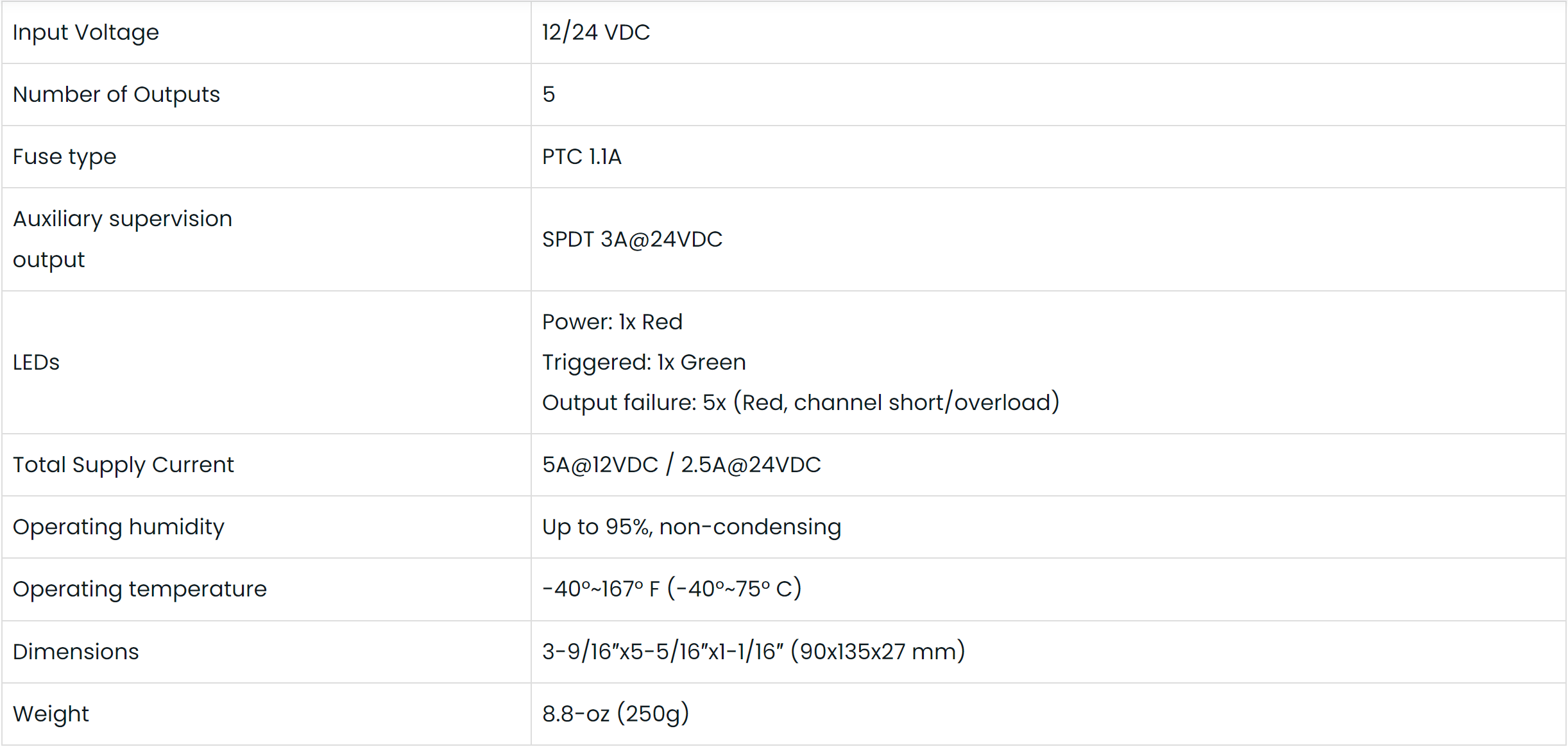 The PD-5PAQ 5-Output Power Distribution Board centralizes the power sources for access control electronic locking devices, such as maglocks, shear locks, electric door strikes, deadbolt locks, and so on. It provides a separate fuse for each output so that problems with one device may be isolated from the other devices.