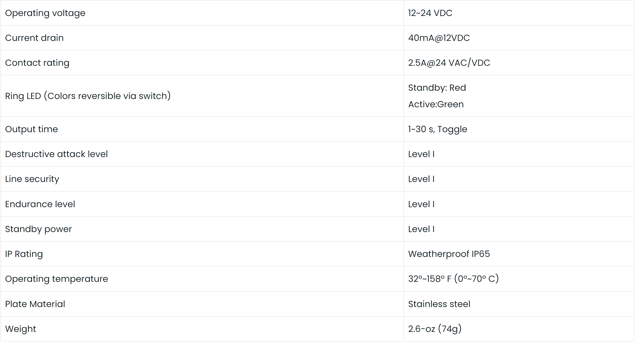 The SD-6176-SS1Q from Seco-Larm is a piezoelectric pushbutton that is vandal-resistant. It is made up of a slimline plate with "EXIT" and "SALIDA" printed on the plate. The lights around the button can be programed to either red or green.