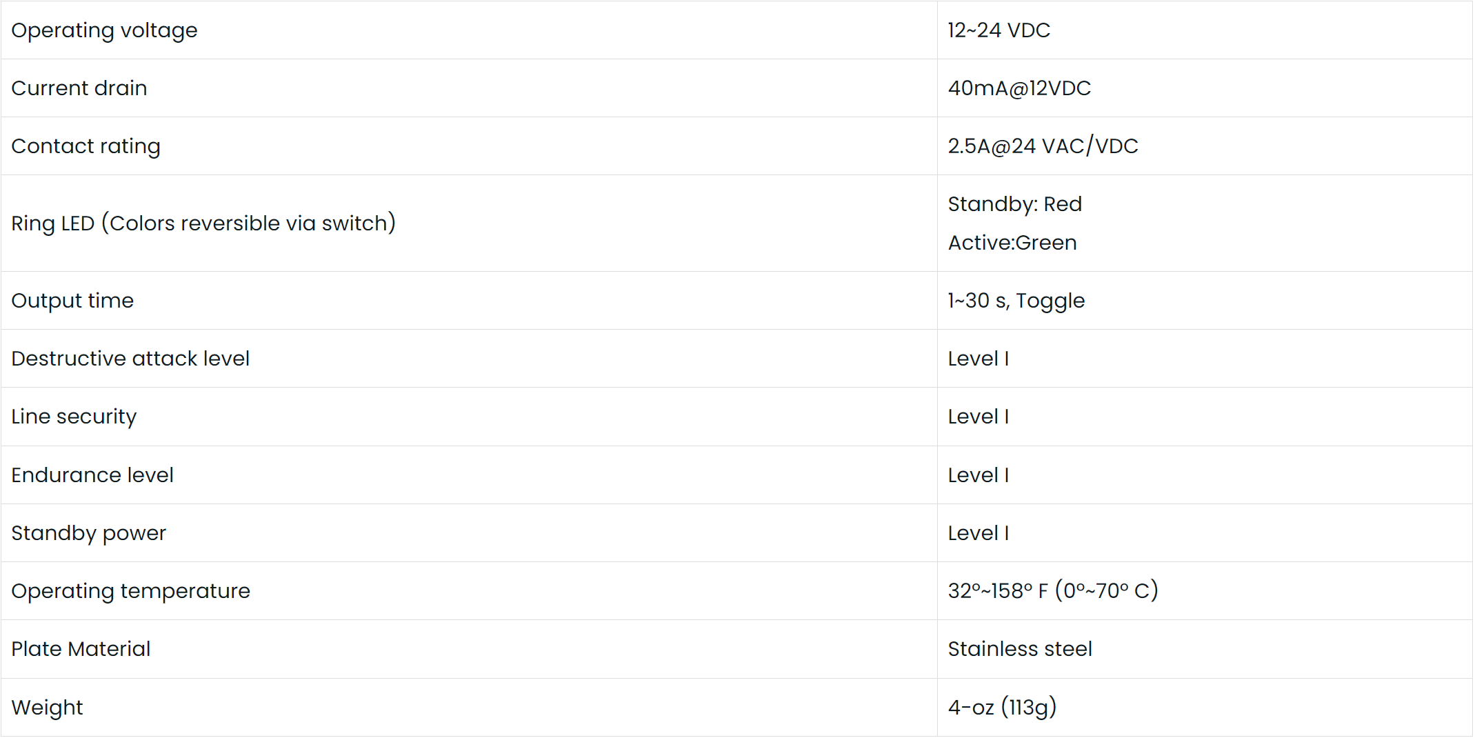 The Seco-Larm SD-6276-SSVQ Pushbutton is a piezoelectric request-to-exit plate for indoor or outdoor use (IP65). You don't have to worry about any moving parts that will fail under heavy duty use. It comes with a LED ring around the button that changes from green to red or red to green when the button is pressed. It is able to have a timed or toggled output. The relay is rated for 2.5A@24VDC and can be programmed between NO and NC outputs. The Seco-Larm SD-6276-SSVQ Pushbutton includes a separate manual override button for use in case of power failure to the pushbutton.